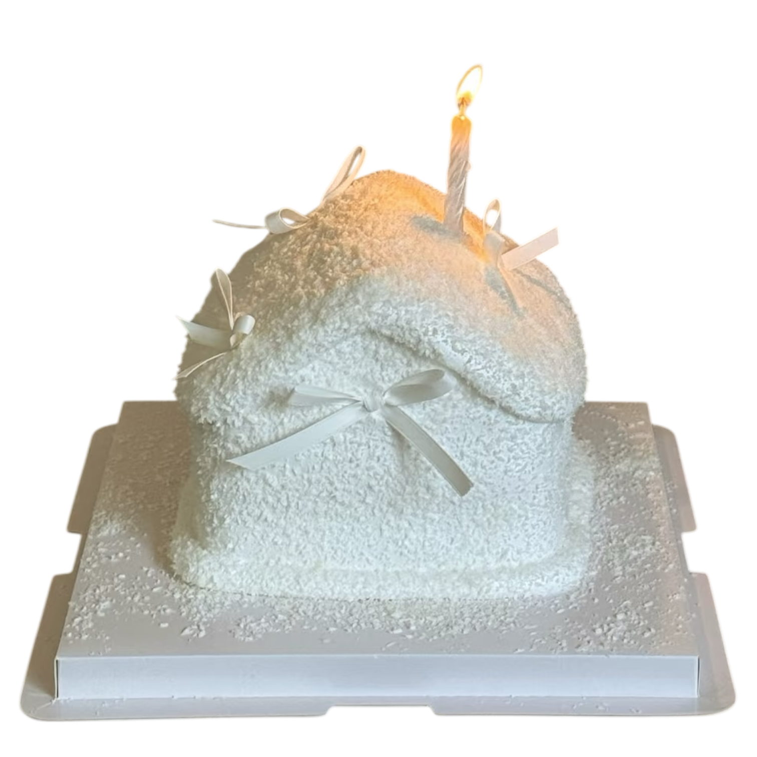 Finished with fine coconut flakes and delicate white ribbon details.