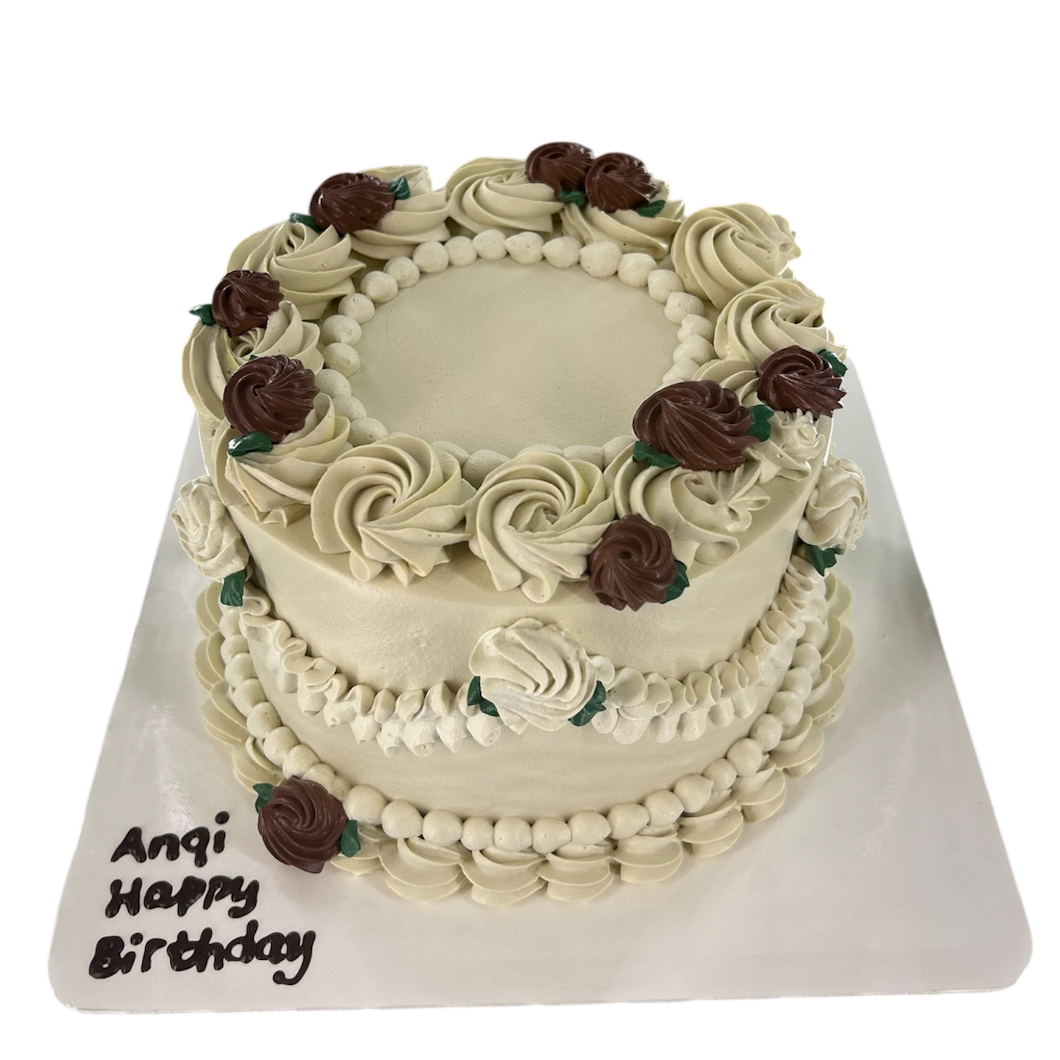 a timeless fresh-cream cake finished with elegant vintage-style piping and delicate floral details in soft neutral tones.