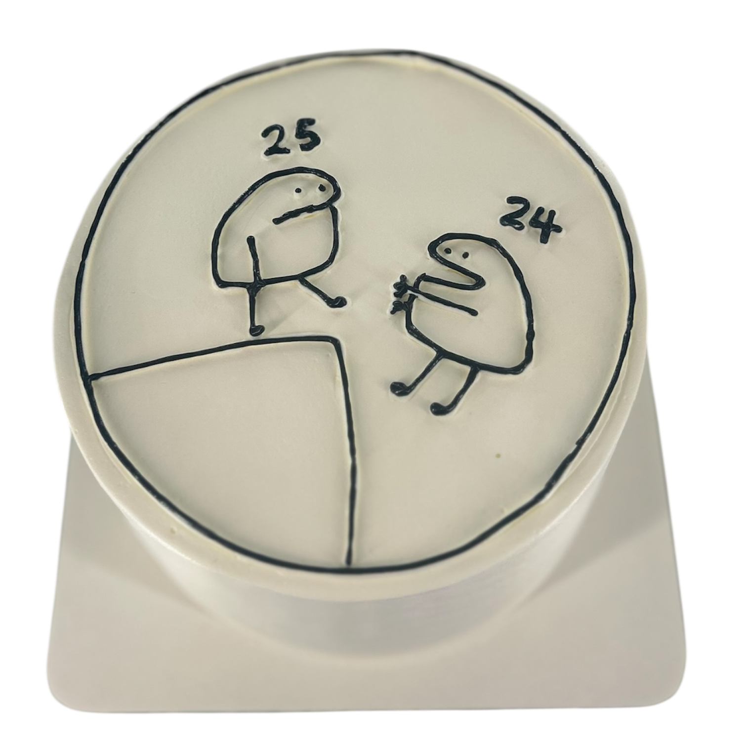 A minimalist fresh-cream cake featuring a hand-drawn illustration on a smooth, clean finish.