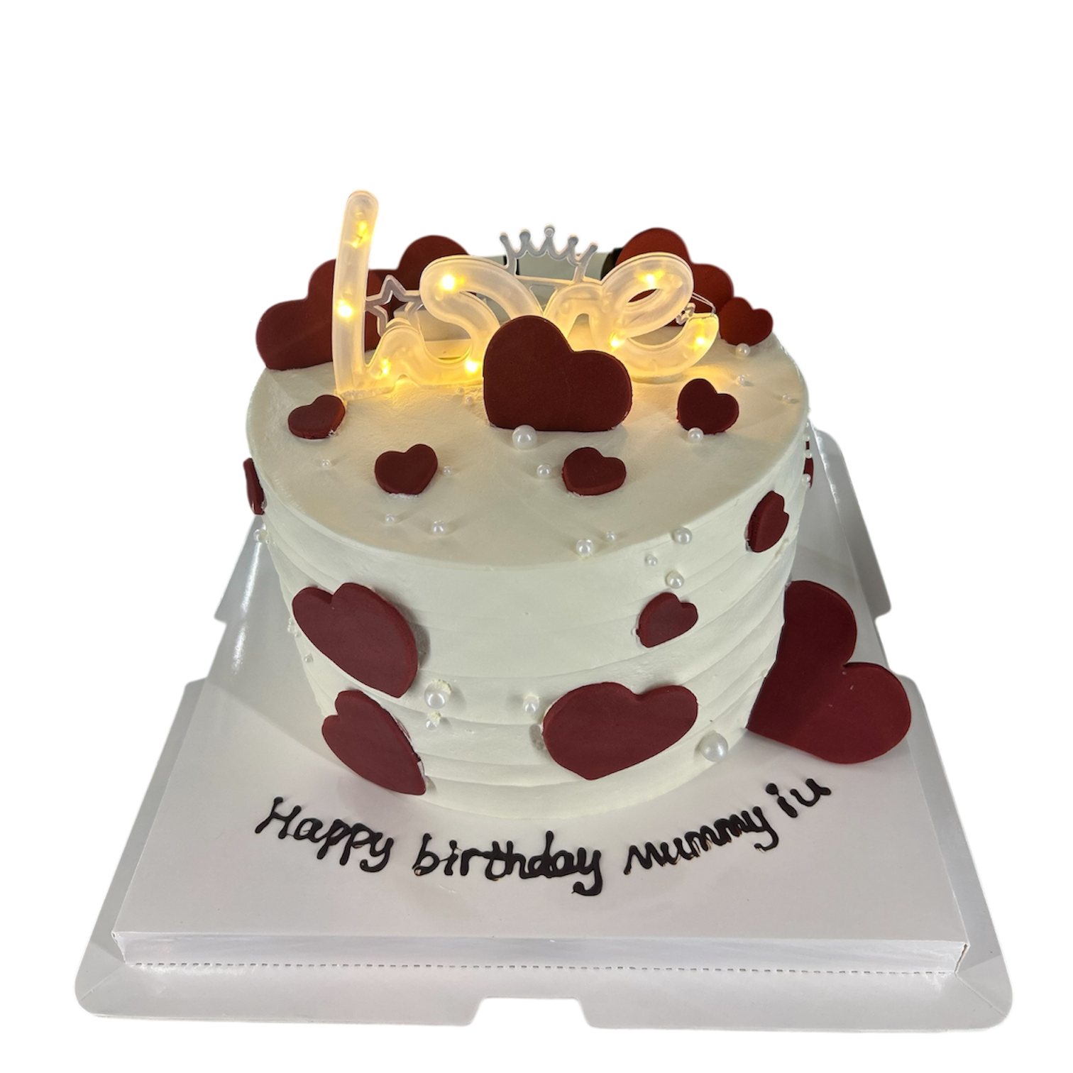 A minimalist fresh-cream cake with a clean white finish, soft heart details and a glowing “Love” topper for a warm, romantic touch.