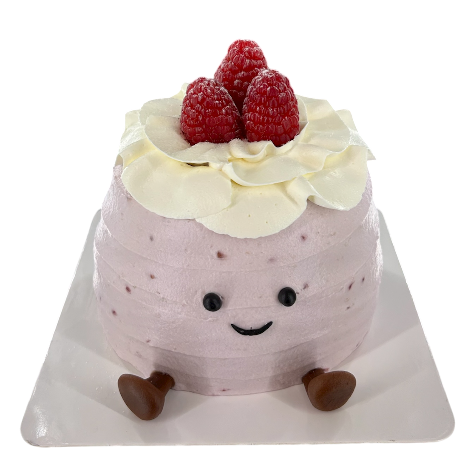 On top, it’s finished with three fresh raspberries and a ring of soft whipped cream. The cute little face and tiny legs make it especially popular with children — it always brings a smile.