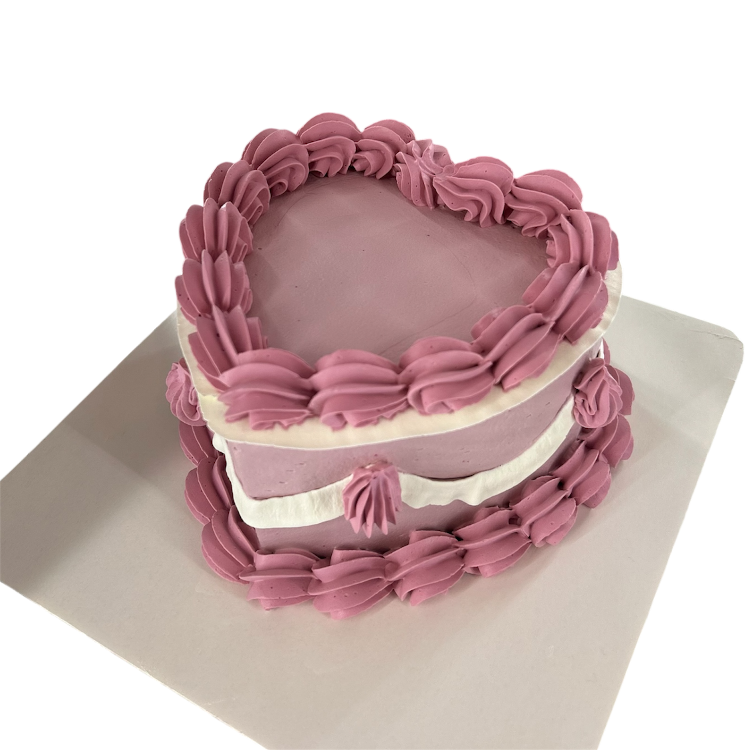 A romantic heart-shaped celebration cake finished with smooth fresh cream and classic vintage piping details.