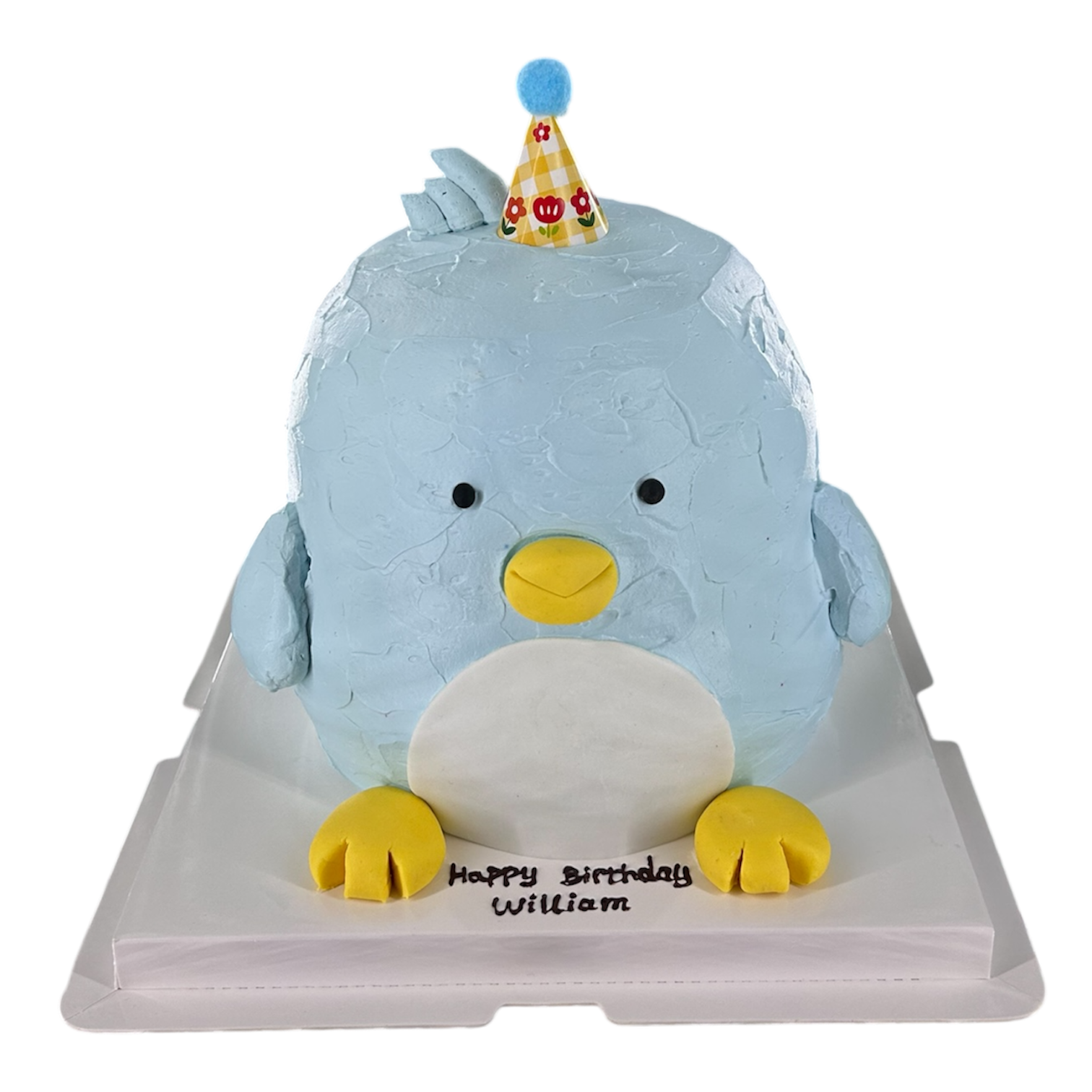 Covered in soft blue cream with handmade details and a little party hat, this penguin makes the perfect centrepiece for a happy celebration.