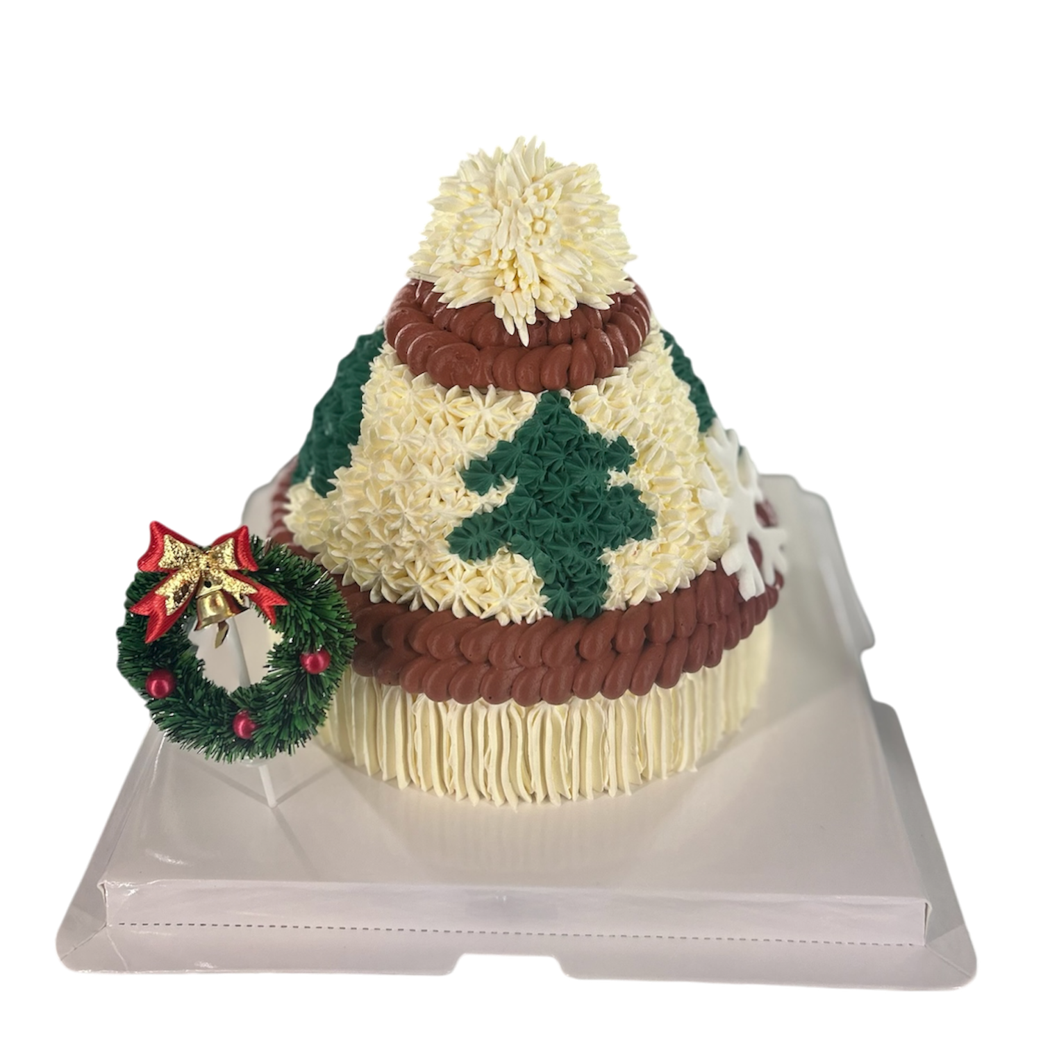 A fluffy fresh cream cake shaped like a Santa hat, decorated with festive colours and cosy holiday details. Perfect for Christmas celebrations.
