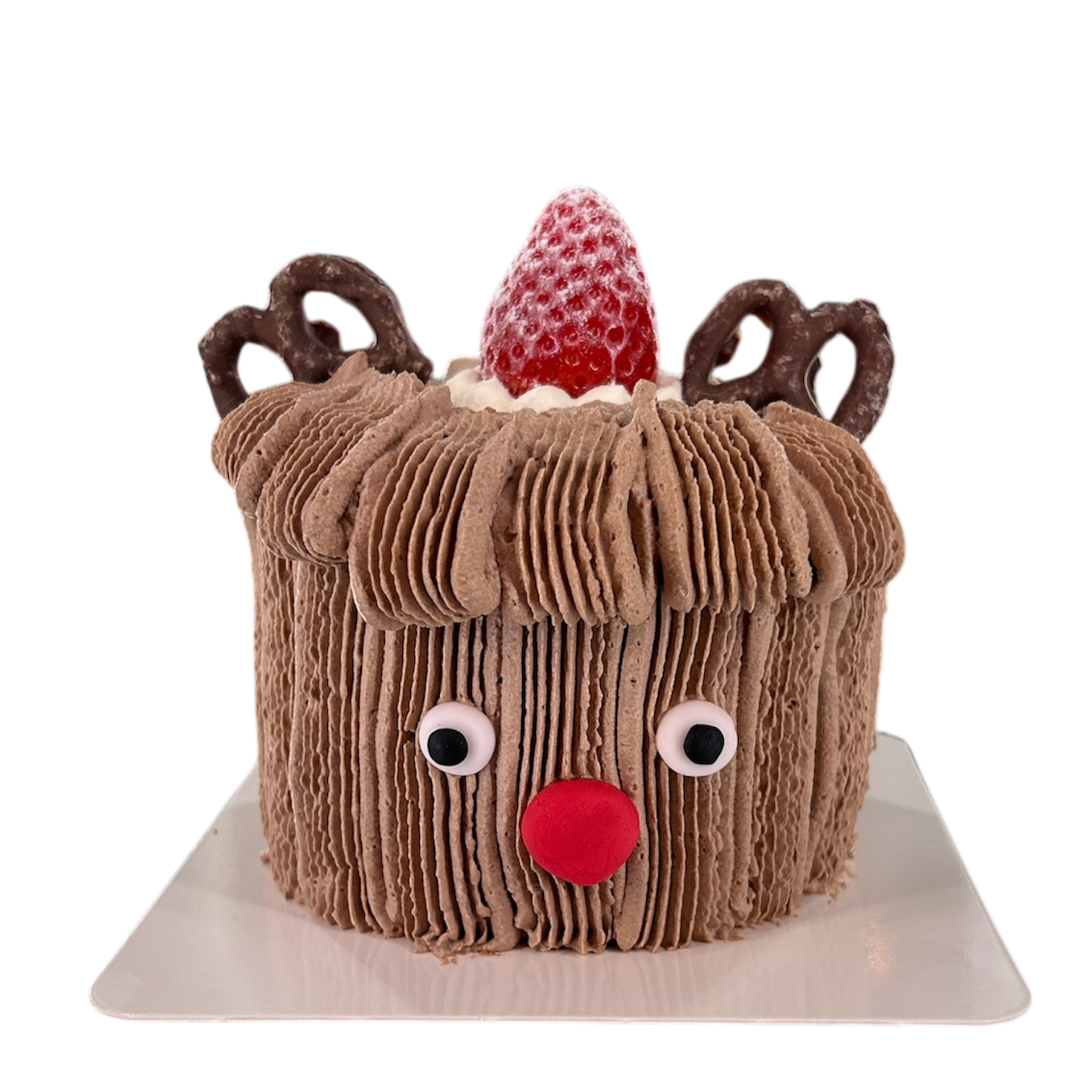 a super cute fresh-cream cake decorated with rich chocolate cream, carefully piped to create its fluffy reindeer shape. Finished with playful pretzel antlers, bright eyes and a sweet red nose, this little reindeer is full of festive charm and chocolatey goodness.